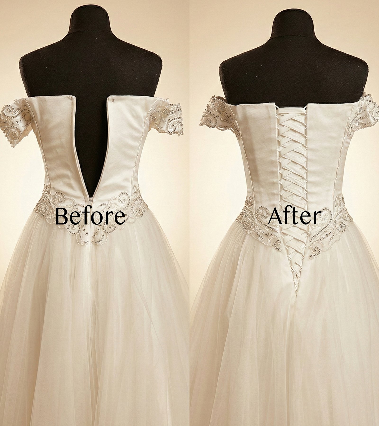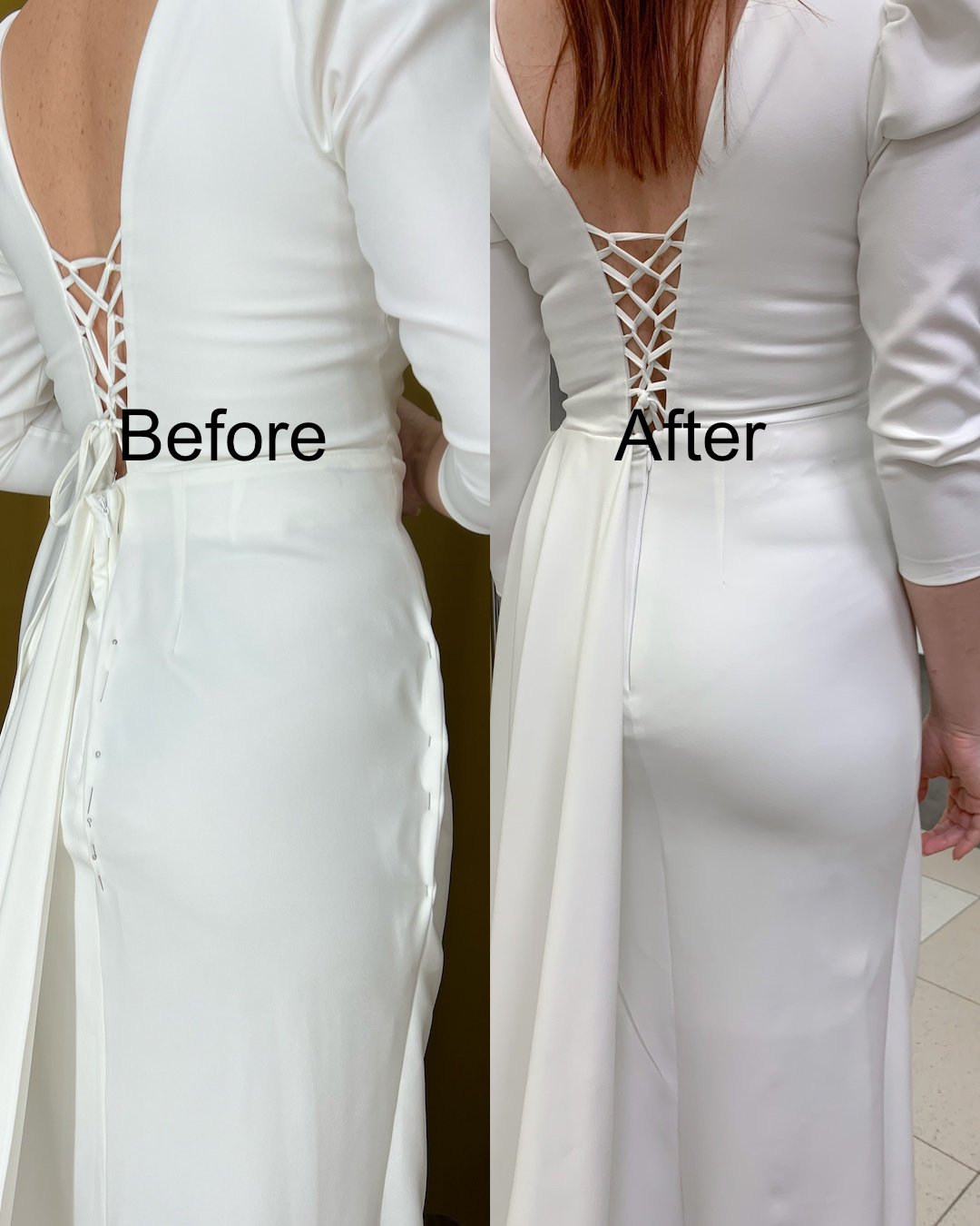 Hemming, bustling, bodice fitting, and resizing. I make sure your gown fits your body like a glove.